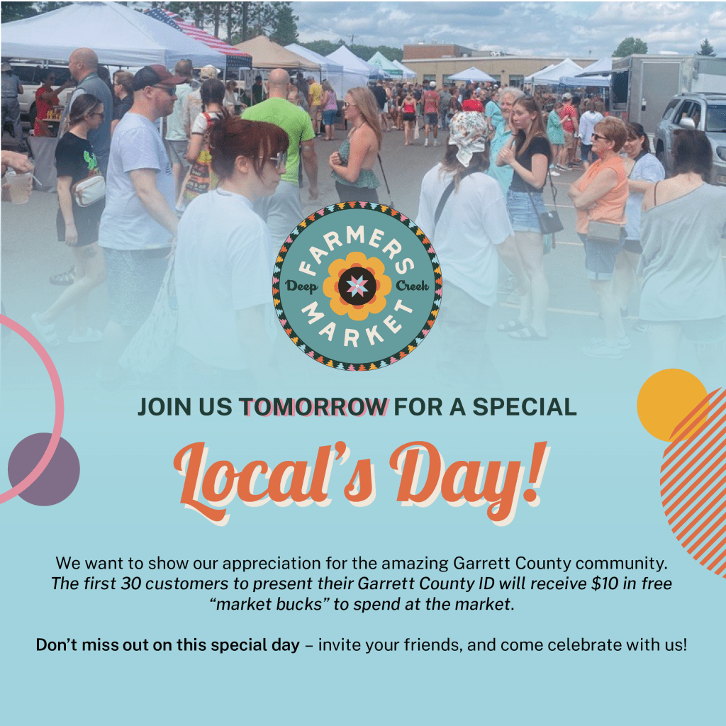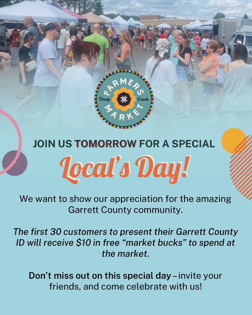 Join us for another special “Local’s Day” at the Deep Creek Farmers Market! We want to show our appreciation for the amazing Garrett County community. The first 30 customers to present their Garrett County ID will receive $10 in free “market bucks” to spend at the market.